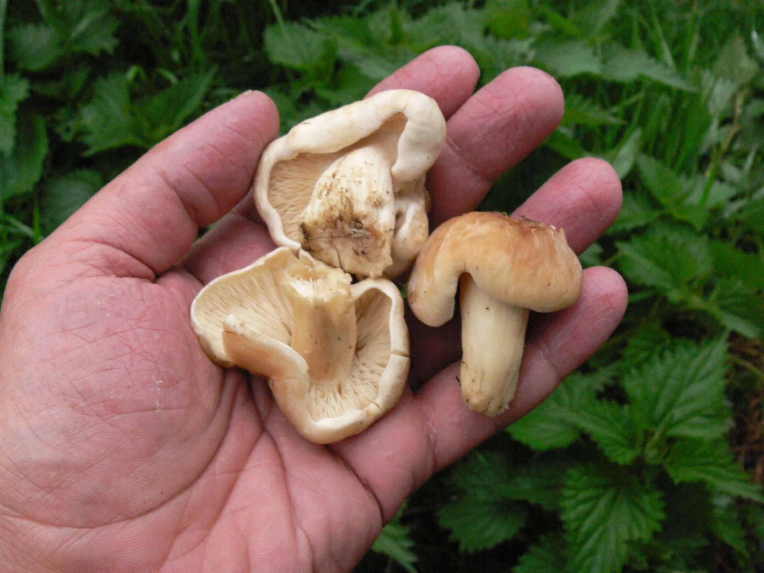 This is shaped roughly like the cultivated mushrooms we buy in shops, but everything, including the gills are off-white. It is supposed to have a surface texture resembling kid glove leather and it has a distinct scent of oat meal. It grows in rough rings, often in association with nettles, and can come up in large quantities. In a good year it is easy to pick several kilos in as many minutes.